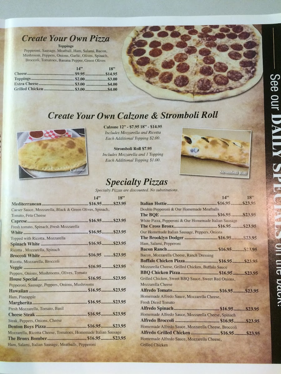For those craving something special, the Specialty 18" Pizzas are a must-try. Options include the Veggie Calzone ($14.99), Buffalo Chicken Pizza ($16.99), Veggie Pizza ($15.99), House Special Calzone ($14.99), and the Bronx Bomber Pizza ($16.99), all delivering bold flavors and satisfying portions.