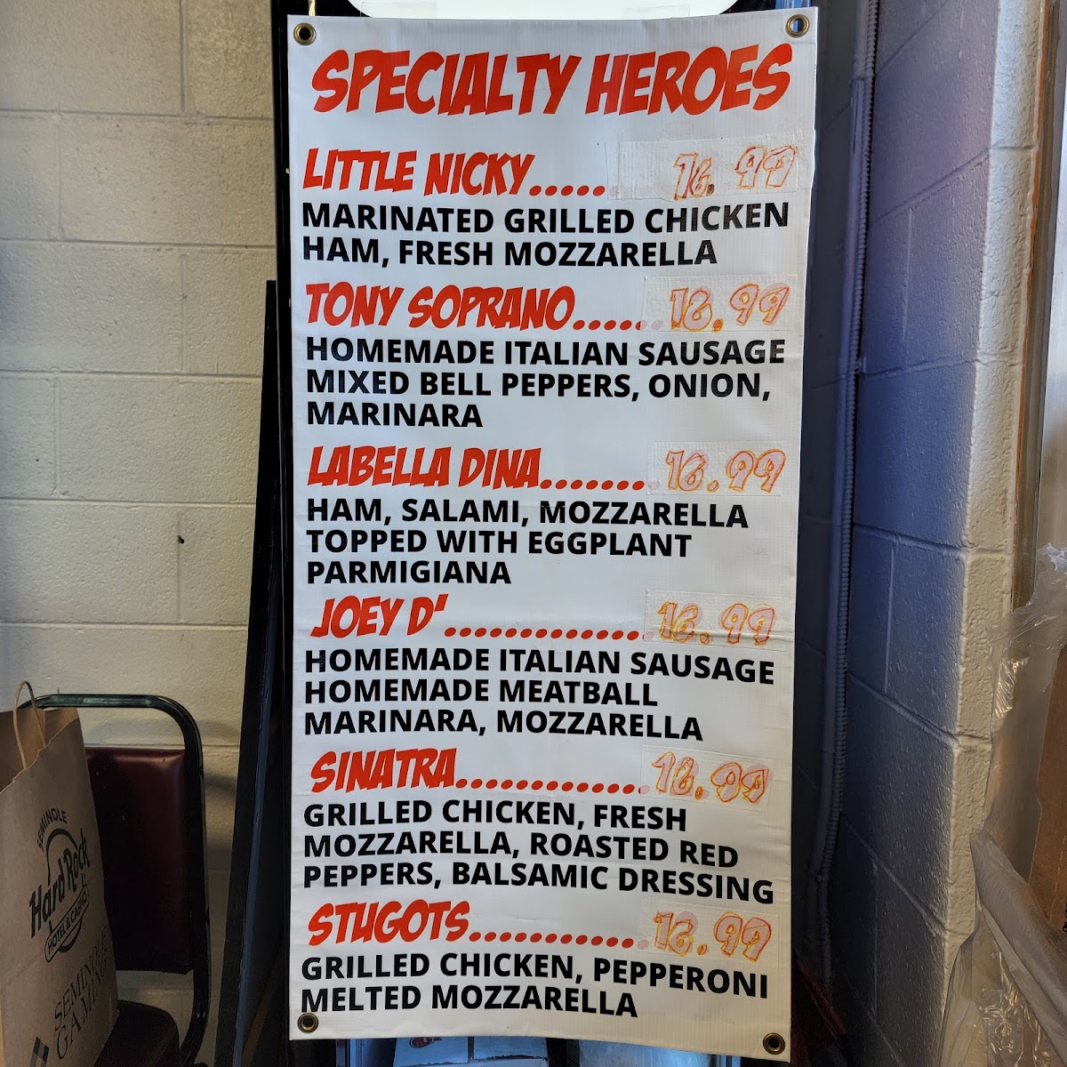 The specialty subs are a highlight, with the Chicken Parmigiana Sub priced at $9.99, and the Little Nicky Sub at $9.99 as well, both offering rich and comforting flavors. The Labella Dina Sub and the Joey D' Sub are each $9.99, with the Meatball Parmigiana Sub rounding out the selection at $8.99, perfect for anyone craving a classic sub.